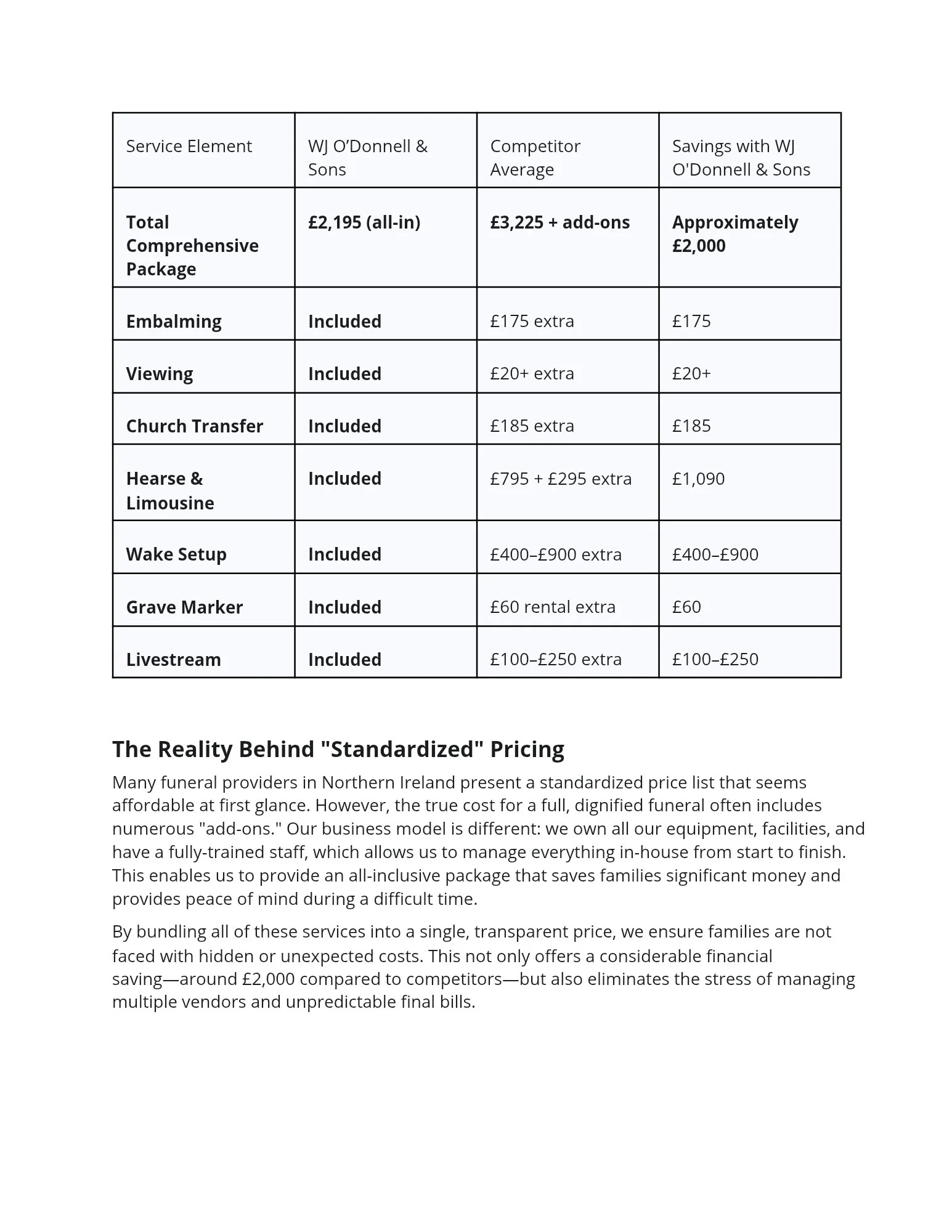 Whereas families in Northern Ireland often face final costs exceeding £4,000 once extras like embalming, limousines, church transfers, marquees, and seating are added, our complete package includes all of these for just £2,195. Our package saves families around £2,000 without compromising on dignity or quality.
